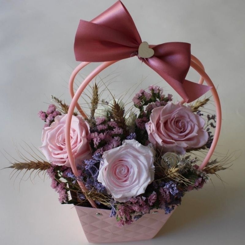 Nosljivi aranžma Rozi v roza odtenkih in narejen iz obstojnih materialov. Zaradi priročne oblike je enostaven za prenašanje in lepo darilo za različne priložnosti.